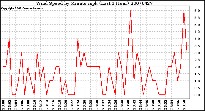 20070427 Wind Speed by Minute mph (Last 1 Hour)