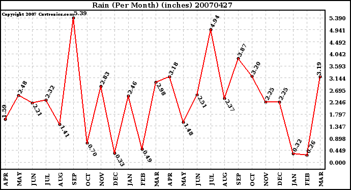 Milwaukee Weather -- 20070427 Rain (Per Month) (inches) -- From curtronics.com by Curt Blank