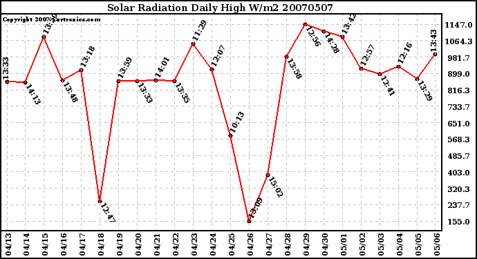 Milwaukee Weather -- 20070507 Solar Radiation Daily High W/m2 -- From curtronics.com by Curt Blank
