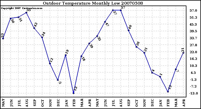 Milwaukee Weather -- 20070508 Outdoor Temperature Monthly Low -- From curtronics.com by Curt Blank