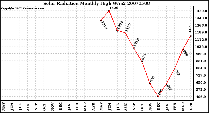 Milwaukee Weather -- 20070508 Solar Radiation Monthly High W/m2 -- From curtronics.com by Curt Blank
