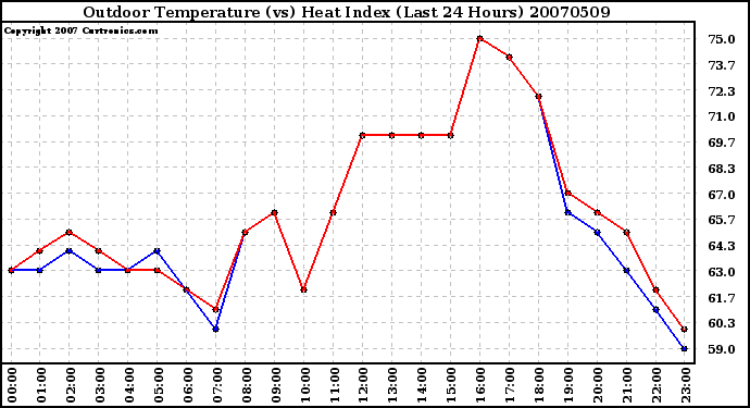Milwaukee Weather -- 20070509 Outdoor Temperature (vs) Heat Index (Last 24 Hours) -- From curtronics.com by Curt Blank