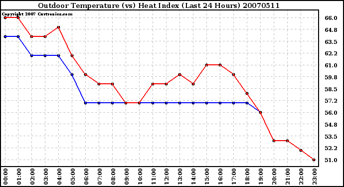 Milwaukee Weather -- 20070511 Outdoor Temperature (vs) Heat Index (Last 24 Hours) -- From curtronics.com by Curt Blank