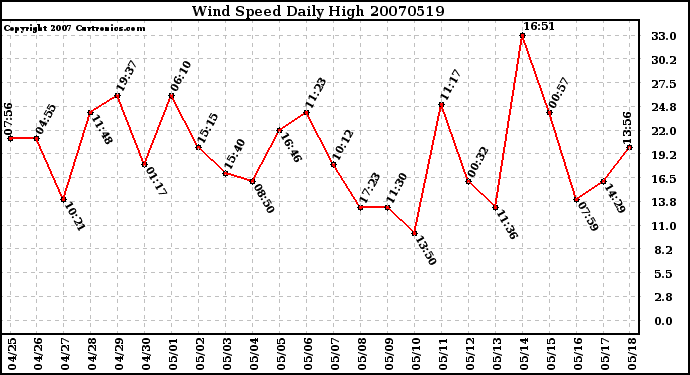 Milwaukee Weather -- 20070519 Wind Speed Daily High -- From curtronics.com by Curt Blank