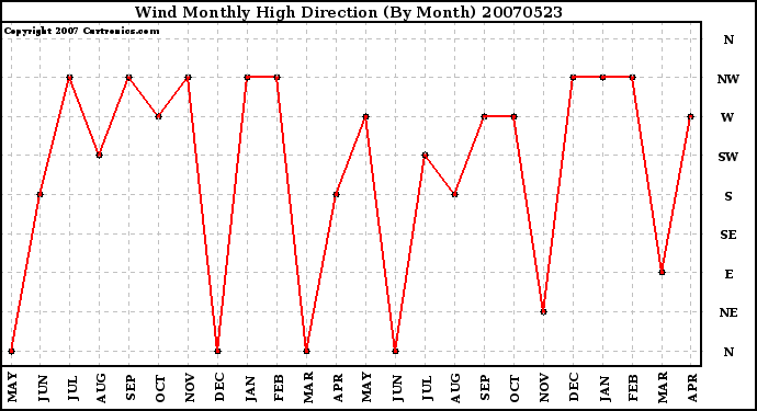 Milwaukee Weather -- 20070523 Wind Monthly High Direction (By Month) -- From curtronics.com by Curt Blank