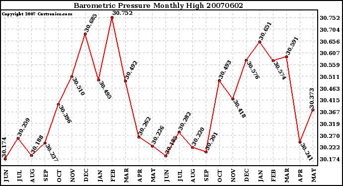 Milwaukee Weather -- 20070602 Barometric Pressure Monthly High -- From curtronics.com by Curt Blank