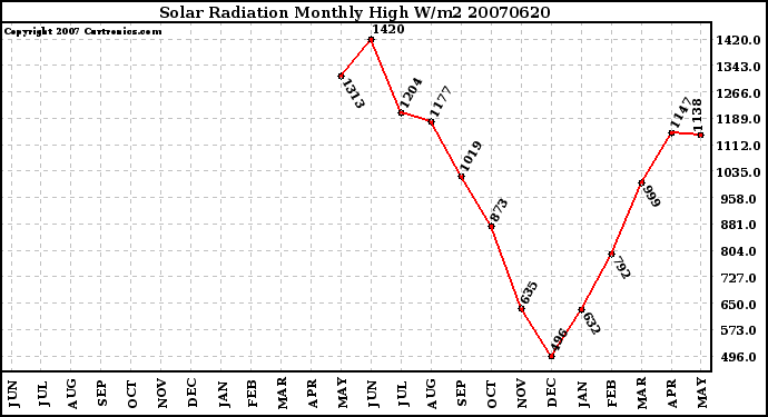Milwaukee Weather -- 20070620 Solar Radiation Monthly High W/m2 -- From curtronics.com by Curt Blank