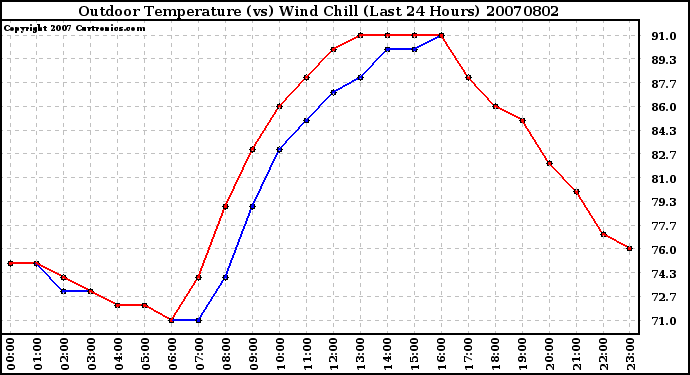 Milwaukee Weather -- 20070802 Outdoor Temperature (vs) Wind Chill (Last 24 Hours) -- From curtronics.com by Curt Blank