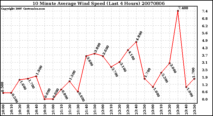 20070806 10 Minute Average Wind Speed (Last 4 Hours)