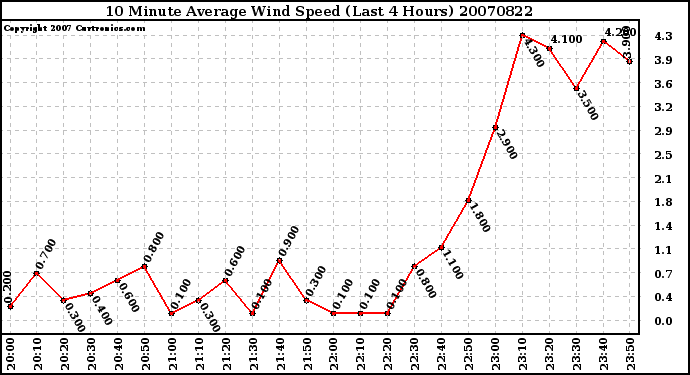 20070822 10 Minute Average Wind Speed (Last 4 Hours)