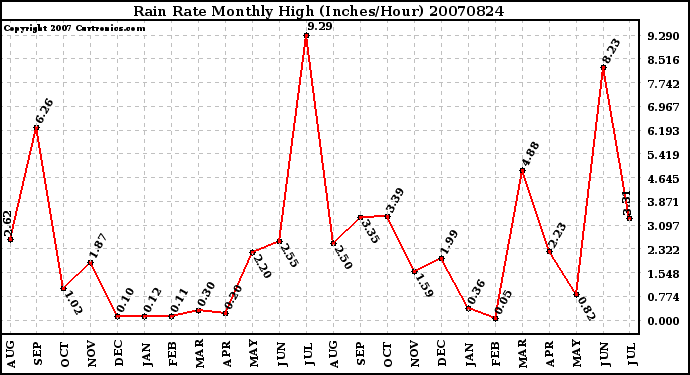 Milwaukee Weather -- 20070824 Rain Rate Monthly High (Inches/Hour) -- From curtronics.com by Curt Blank