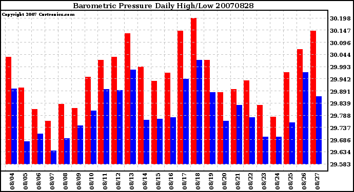 Milwaukee Weather -- 20070828 Barometric Pressure Daily High/Low -- From curtronics.com by Curt Blank