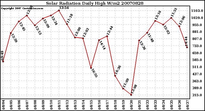 Milwaukee Weather -- 20070828 Solar Radiation Daily High W/m2 -- From curtronics.com by Curt Blank
