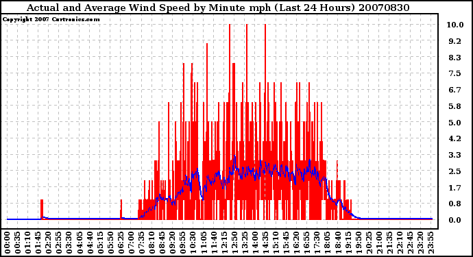 20070830 Actual and Average Wind Speed by Minute mph (Last 24 Hours)