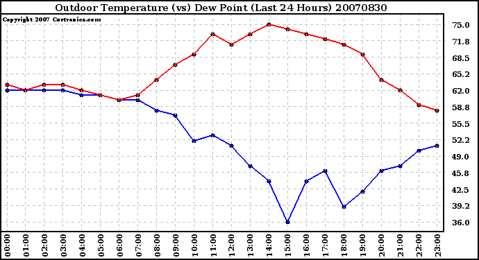 Milwaukee Weather -- 20070830 Outdoor Temperature (vs) Dew Point (Last 24 Hours) -- From curtronics.com by Curt Blank
