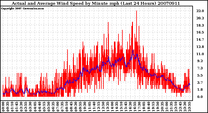 20070911 Actual and Average Wind Speed by Minute mph (Last 24 Hours)