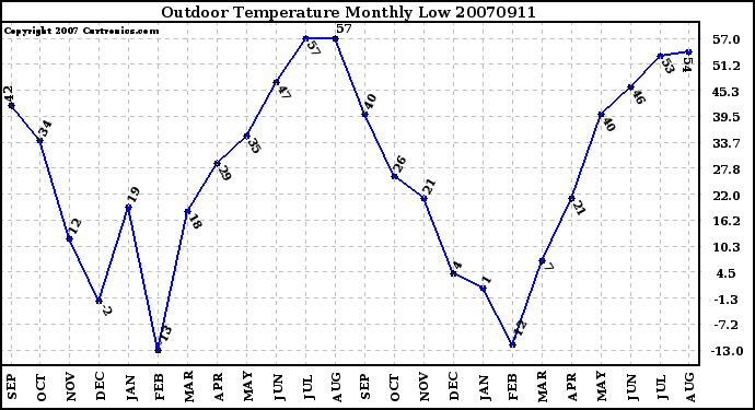 Milwaukee Weather -- 20070911 Outdoor Temperature Monthly Low -- From curtronics.com by Curt Blank