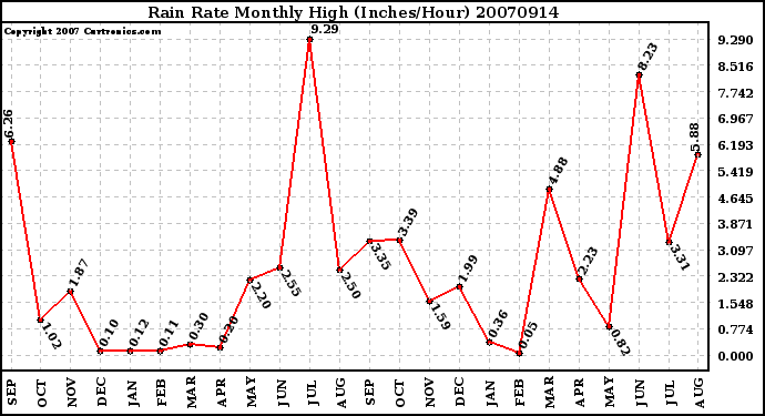 Milwaukee Weather -- 20070914 Rain Rate Monthly High (Inches/Hour) -- From curtronics.com by Curt Blank