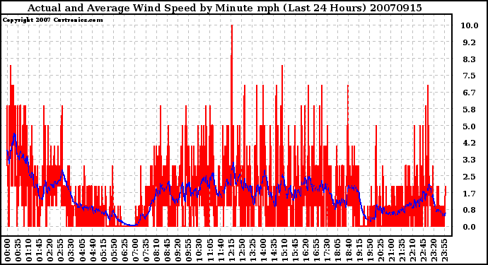 20070915 Actual and Average Wind Speed by Minute mph (Last 24 Hours)