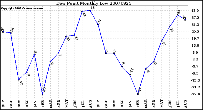 Milwaukee Weather -- 20070925 Dew Point Monthly Low -- From curtronics.com by Curt Blank