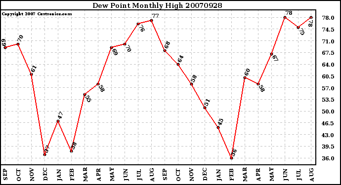 Milwaukee Weather -- 20070928 Dew Point Monthly High -- From curtronics.com by Curt Blank