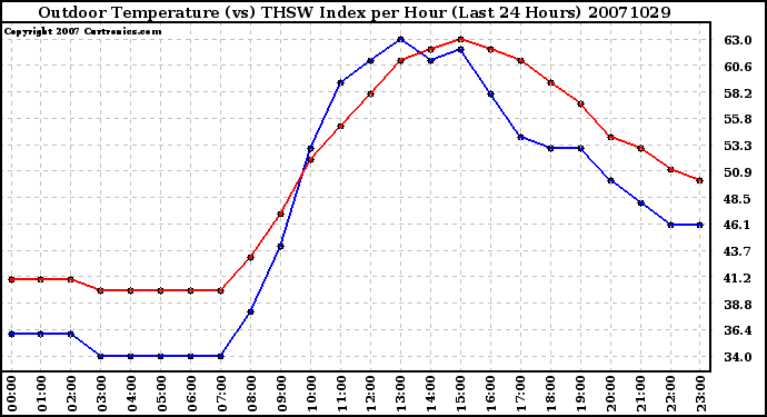 Milwaukee Weather -- 20071029 Outdoor Temperature (vs) THSW Index per Hour (Last 24 Hours) -- From curtronics.com by Curt Blank