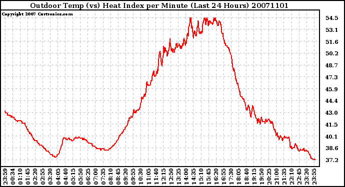 Milwaukee Weather -- 20071101 Outdoor Temp (vs) Heat Index per Minute (Last 24 Hours) -- From curtronics.com by Curt Blank