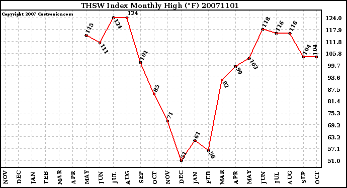 Milwaukee Weather -- 20071101 THSW Index Monthly High (°F) -- From curtronics.com by Curt Blank