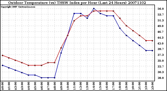 Milwaukee Weather -- 20071102 Outdoor Temperature (vs) THSW Index per Hour (Last 24 Hours) -- From curtronics.com by Curt Blank