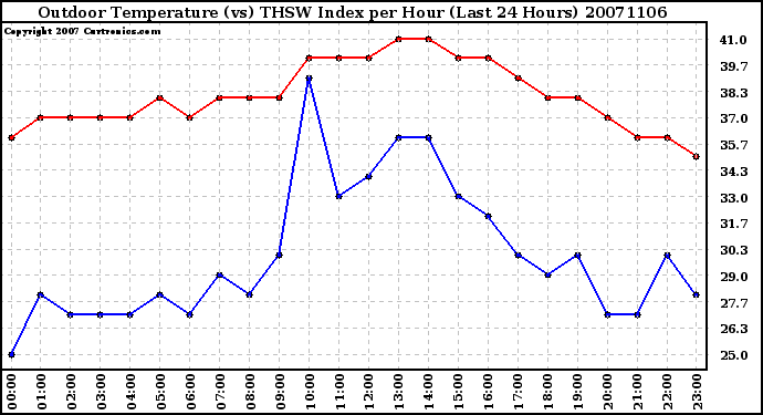 Milwaukee Weather -- 20071106 Outdoor Temperature (vs) THSW Index per Hour (Last 24 Hours) -- From curtronics.com by Curt Blank