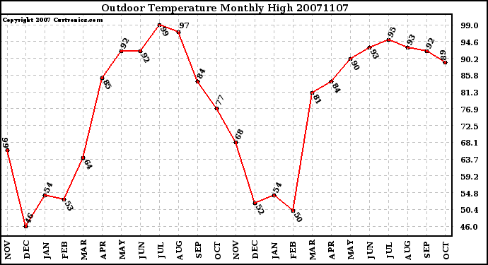 Milwaukee Weather -- 20071107 Outdoor Temperature Monthly High -- From curtronics.com by Curt Blank