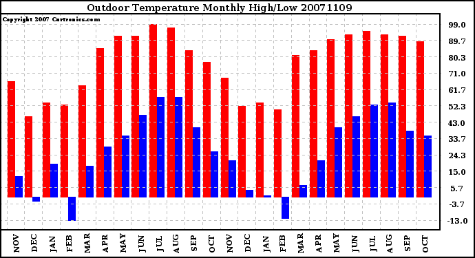 Milwaukee Weather -- 20071109 Outdoor Temperature Monthly High/Low -- From curtronics.com by Curt Blank