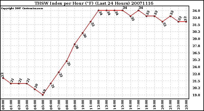 Milwaukee Weather -- 20071116 THSW Index per Hour (°F) (Last 24 Hours) -- From curtronics.com by Curt Blank