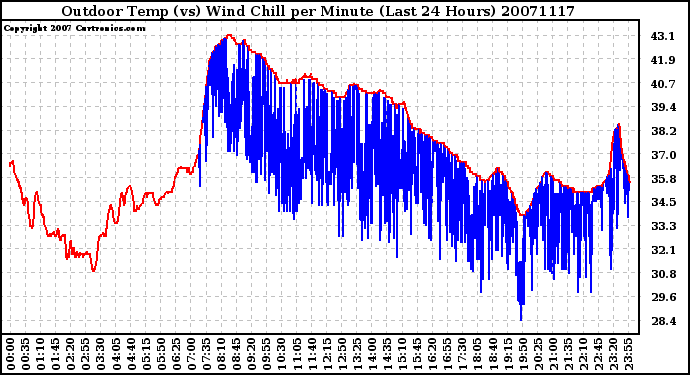 Milwaukee Weather -- 20071117 Outdoor Temp (vs) Wind Chill per Minute (Last 24 Hours) -- From curtronics.com by Curt Blank