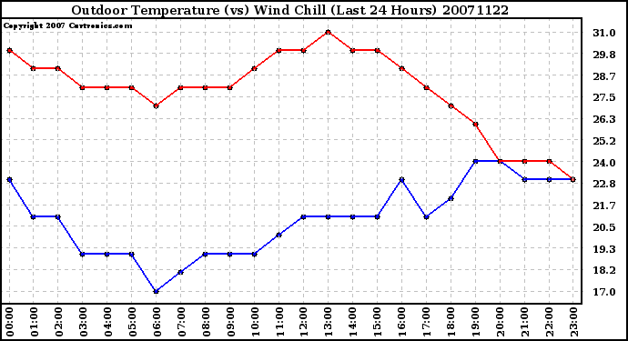Milwaukee Weather -- 20071122 Outdoor Temperature (vs) Wind Chill (Last 24 Hours) -- From curtronics.com by Curt Blank