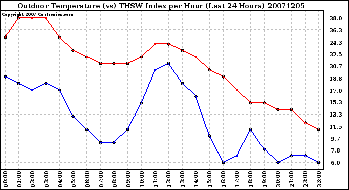 Milwaukee Weather -- 20071205 Outdoor Temperature (vs) THSW Index per Hour (Last 24 Hours) -- From curtronics.com by Curt Blank