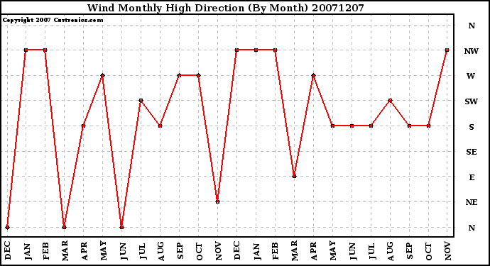 Milwaukee Weather -- 20071207 Wind Monthly High Direction (By Month) -- From curtronics.com by Curt Blank