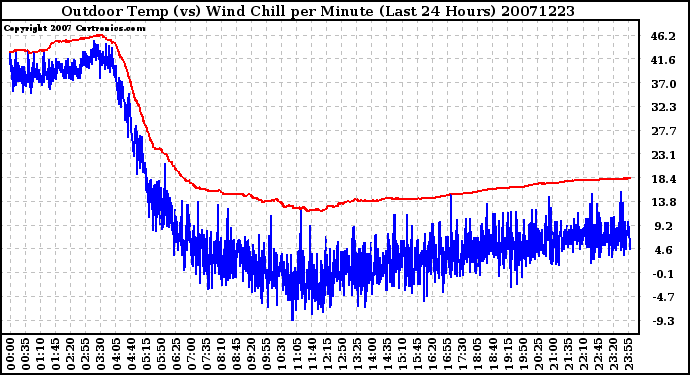 Milwaukee Weather -- 20071223 Outdoor Temp (vs) Wind Chill per Minute (Last 24 Hours) -- From curtronics.com by Curt Blank