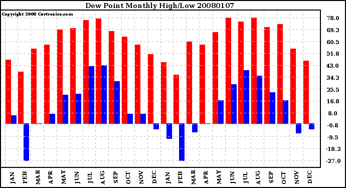 Milwaukee Weather -- 20080107 Dew Point Monthly High/Low -- From curtronics.com by Curt Blank