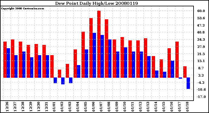 Milwaukee Weather -- 20080119 Dew Point Daily High/Low -- From curtronics.com by Curt Blank