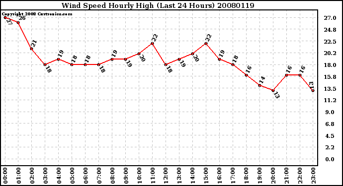 Milwaukee Weather -- 20080119 Wind Speed Hourly High (Last 24 Hours) -- From curtronics.com by Curt Blank