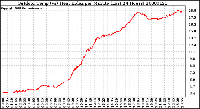 Milwaukee Weather -- 20080121 Outdoor Temp (vs) Heat Index per Minute (Last 24 Hours) -- From curtronics.com by Curt Blank