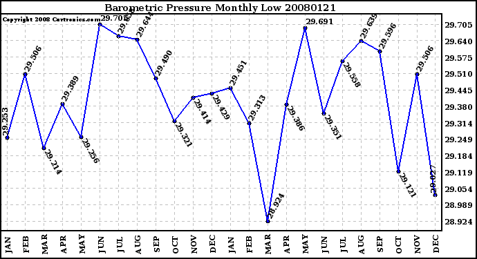 Milwaukee Weather -- 20080121 Barometric Pressure Monthly Low -- From curtronics.com by Curt Blank