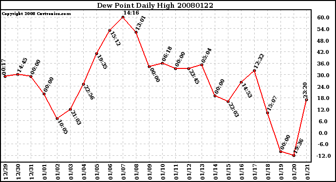 Milwaukee Weather -- 20080122 Dew Point Daily High -- From curtronics.com by Curt Blank