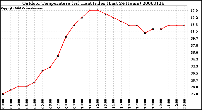 Milwaukee Weather -- 20080128 Outdoor Temperature (vs) Heat Index (Last 24 Hours) -- From curtronics.com by Curt Blank