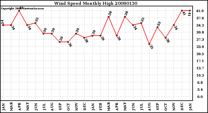 Milwaukee Weather -- 20080130 Wind Speed Monthly High -- From curtronics.com by Curt Blank
