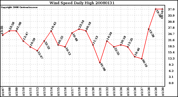 Milwaukee Weather -- 20080131 Wind Speed Daily High -- From curtronics.com by Curt Blank