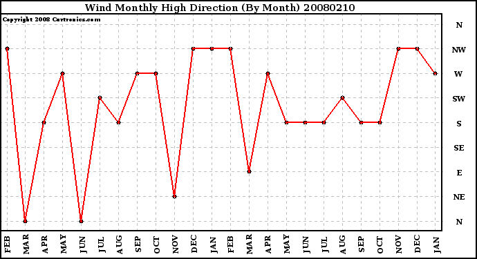 Milwaukee Weather -- 20080210 Wind Monthly High Direction (By Month) -- From curtronics.com by Curt Blank