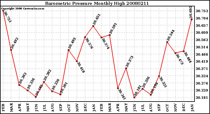 Milwaukee Weather -- 20080211 Barometric Pressure Monthly High -- From curtronics.com by Curt Blank