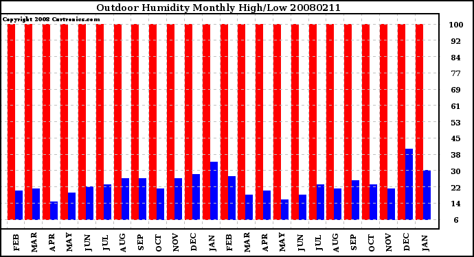 Milwaukee Weather -- 20080211 Outdoor Humidity Monthly High/Low -- From curtronics.com by Curt Blank